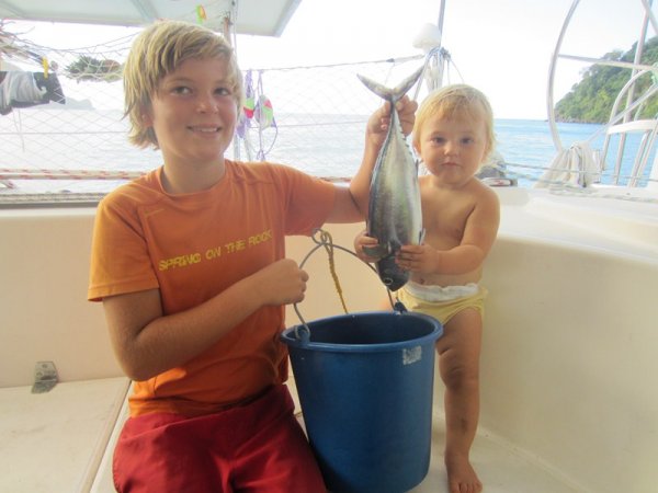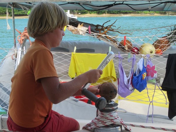 Nous laisserons un adulte de garde sur le bateau, pour parer à un dérapage de l’ancre ou à une rotation des vents ou des courants qui nous pousserait aux cailloux, nombreux dans les parages.