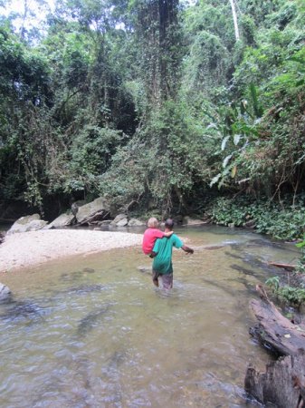 Tout se passe bien jusqu’au moment où le guide traverse la rivière avec de l’eau jusqu’à la taille. Il se retourne et nous fait signe de le suivre… Je m’avance, l’appareil photo dans la main, levé vers le ciel et rejoins l’autre rive. Les enfants sont restés bloqués de l’autre coté ! Boy, de bonne grâce, fait deux aller-retours pour les transporter dans les bras, comme autrefois les jeunes filles des propriétés.